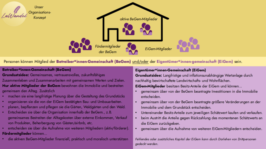 Mit dem Verein LaWandel haben wir letztlich die Betreibergemeinschaft (BeGem) gegründet, also eine Gruppe von Menschen, die im Projekt aktiv leben und mitgestalten oder uns bei den Schritten bis zur Umsetzung (und evtl darüber hinaus) unterstützen und das Projekt mitverfolgen möchten.